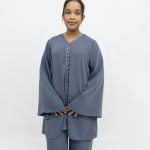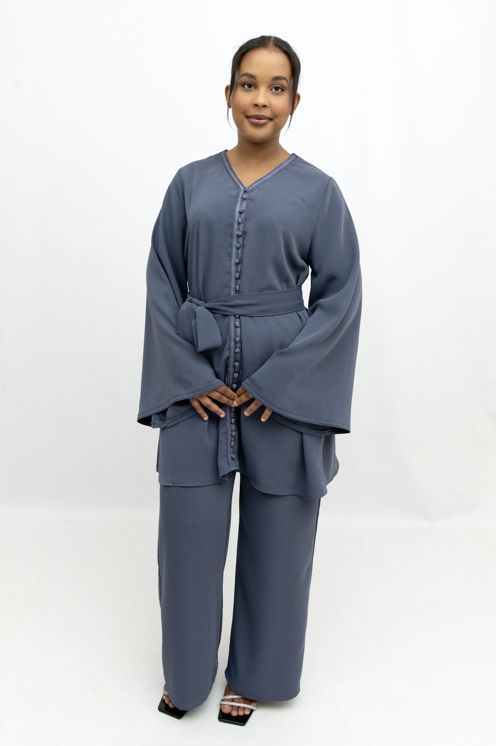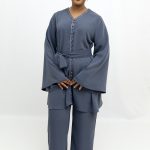 A refined two piece set designed for a polished and elegant look. The relaxed fit top pairs perfectly with the wide leg trousers, creating a modest and stylish outfit.