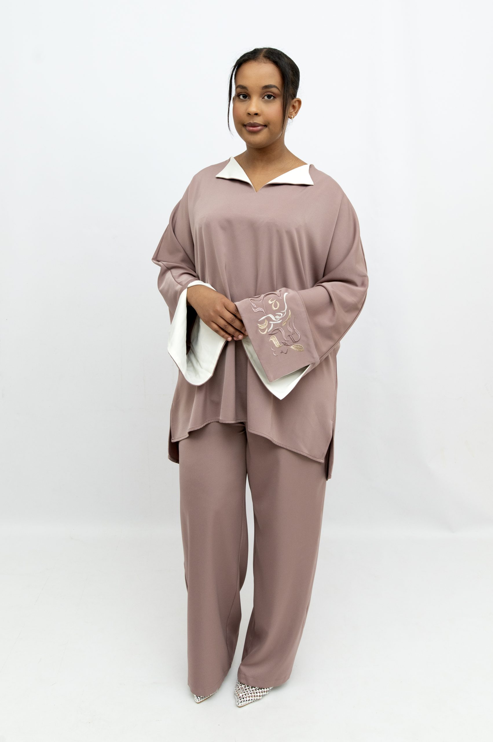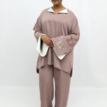 An elegant two piece set designed for comfort and effortless style. The relaxed fit top pairs perfectly with the wide leg trousers for a modest and flowy look.